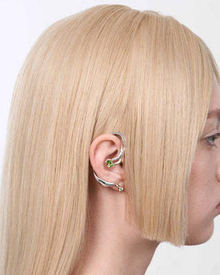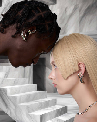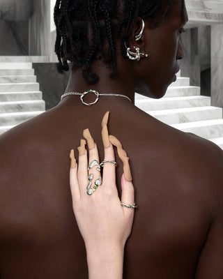 The body as architecture, jewelry as space - Blurring the lines between adornment and form, this collaboration reinterprets spatial design through jewelry. Inspired by the sculptural essence of Z I D I ‘s Arca Bag and infused with its signature green, each piece embodies movement, deconstruction, and illusion. A bold fusion of morphology and wearability, crafted for those who embrace the surreal.